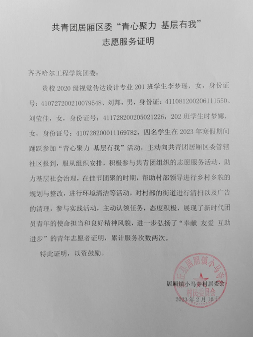 2月16日下午,信息工程系视觉传达设计专业的李梦瑶、刘莹佳、刘邦、时梦娜四名同学在张晶老师的指导下,在河南省新乡市居厢镇小马寺村完成了第四学期志愿服务活动,并在过程中取得良好成果,在最后也受到了村领导和居民的感谢。