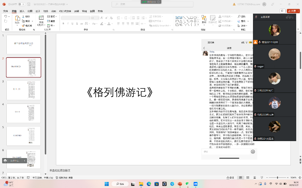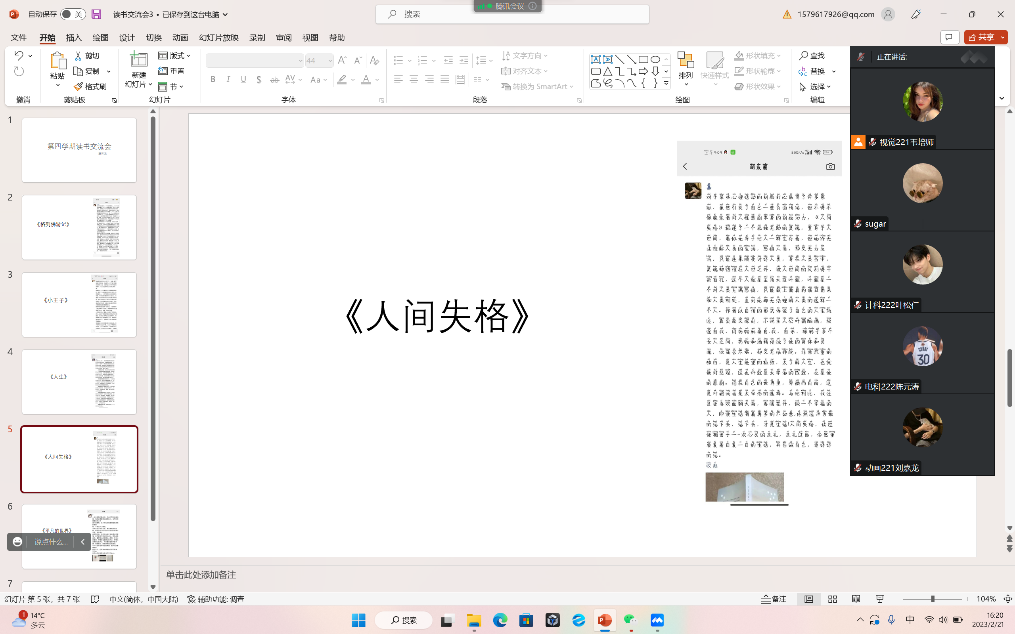 2月20日——2月26日,韦培师小组通过腾讯会议召开了第四学期第三次读书交流分享会议,由组长韦培师主持,组员陈元涛,唐立涛,叶松仁,刘嘉龙四人参加。