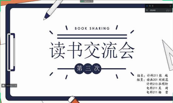 2月12日上午,张越小组召开了第四学期第三次读书交流会,会议前期,张越小组进行隔段读书交流会。由组长张越主持,组员杜明轩,刘欣蕊,杨荧,吴琦4人参加。
