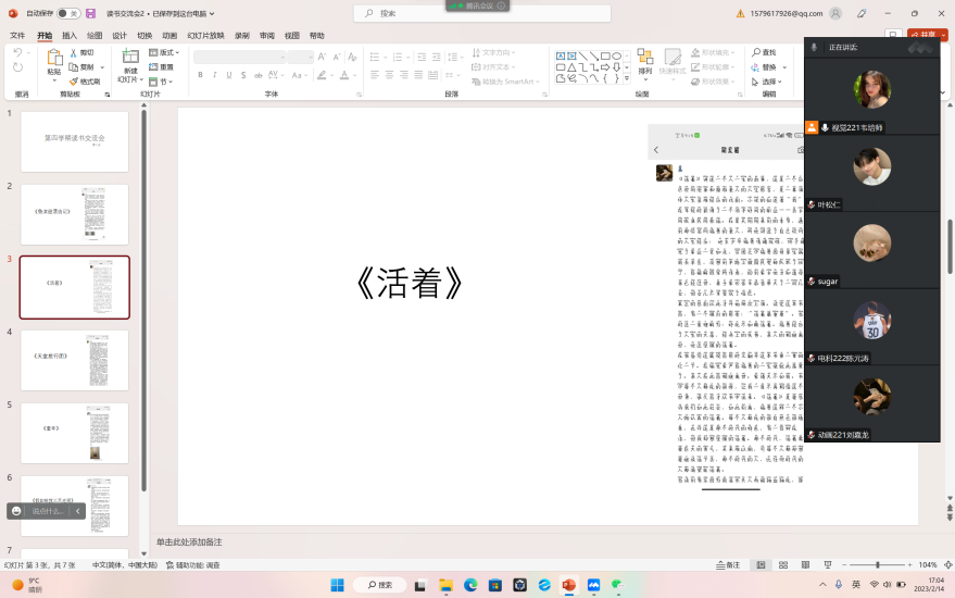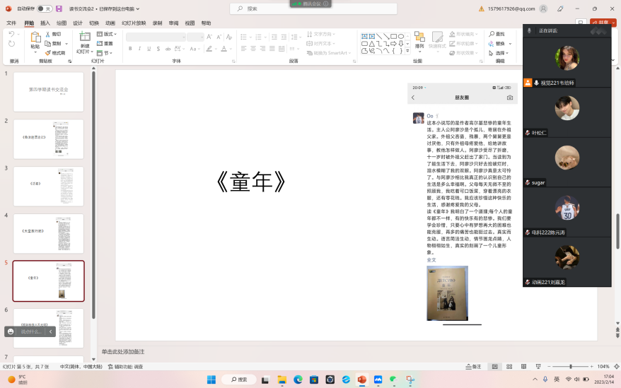 2月13日—2月19日,韦培师小组通过腾讯会议召开了第四学期第二次读书交流分享会议,由组长韦培师主持,组员陈元涛,叶松仁,唐立涛,刘嘉龙四人参加。