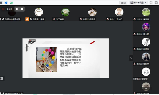 周总结汇报仍是共享自己组的PPT进行介绍,然后指导教师对这一组的汇报进行点评,并对所完成的工作提出建议和要求。由于上周大家的工作完成的不是很好,因此本次汇报以之前出现的问题为重点。汇报中,孙健博组工作较好,不仅做了许多工作,还将自己的活动做成了短视频。而其他组,虽然第四学期已经过半,但是仍未开展公益活动,因此对其提出批评,并要求尽快开展活动。