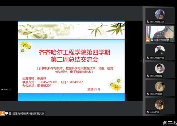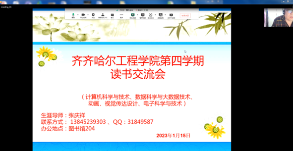 1月15日下午,信息工程系生涯导师张庆祥通过腾讯会议召开第四学期读书交流会并对第二周活动情况进行总结。