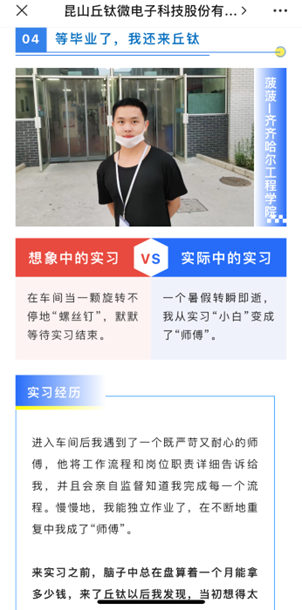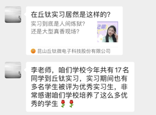 8月24日,电科201班饶人菠同学被昆山丘钛微电子科技股份有限公司评为优秀实习生。饶人菠同学自上岗以来工作认真,服从公司的安排,能够虚心向有经验的同事请教,经过两天的培训就能够掌握岗位工作流程及加工臂的操作方法,并能够独立工作,受到了领导的肯定。