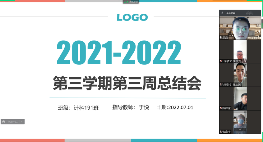 2022年7月1日,计科191在线上开展了第三学期第三周总结会,会议由指导老师于悦老师主持,计科191班39人全部参加。