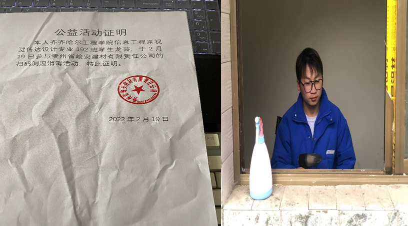 今年第四学期信息工程系026组龙芸同学在贵州省峻安建材有限公司担任疫情防控工作,负责对进入公司的人员扫码,查讯的是否经过中高风险地区、检查体温、提醒入內人员正确佩戴口罩,并进行手部消毒。每天早八点至下午四点半。这项工作需要耐心和细心。关注进入人员健康安全情况,不能疏忽,要坚守防疫的要求。坚守岗位为疫情防控作出白己的一份贡載,自己也感到很有成就感。