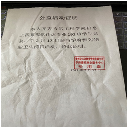 今年第四学期组龙芸同学在贵州省黔南布依族苗族自治州瓮安县学府雅苑物业组织的卫生清扫活动及消毒活动中担任托扫工作,本次活动为学府雅苑的住户提供了非常好的居住环境体验通过此次活动不仅为社会做出了贡献,也提高了个人思想素质,理解干净生活的来之不易。