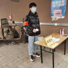 2月13日,刘艺明在郑州市金水区国泰一品庄园当志愿者服务社区。在值班期间协助门岗大叔一起对进入社区外来车辆以及人员进行健康检测和登记。