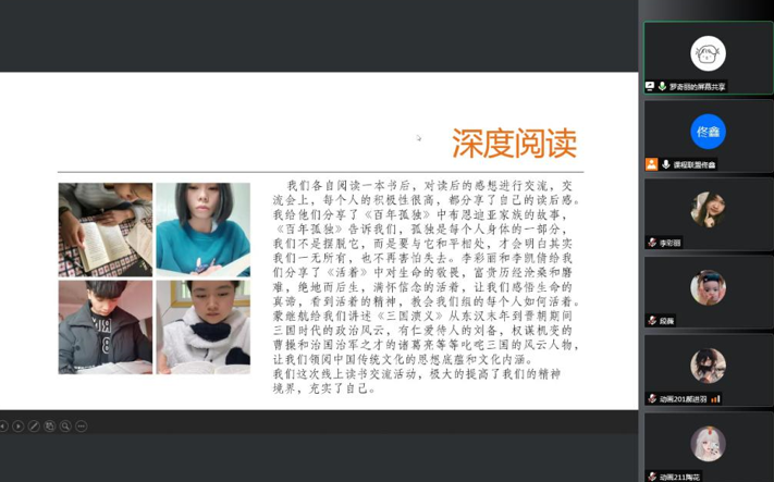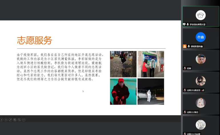首先,佟老师首先对各小组报道进行指导,强调报道要有六要素,即时间、地点、人物、起因、经过、结果,这些都需要在第四学期的报道中体现。其次由第二小组组长罗奇丽对近期四学期实施情况进行汇报,该组开展了“深度阅读”、“字帖临摹”、“志愿活动”这三项。由于疫情原因,小组成员分别在家乡开展志愿活动,工作内容是为小区居民测量体温,为街道清理垃圾,蒙继航为返回小区的居民做登记等。虽然志愿工作的内容都极其简单,但是却极其考验耐心和吃苦的能力。接下来佟老师特别强调年后需进行“母校回访”的任务,应当根据当地疫情规定来执行,可以通过线上与母校老师取得联系。最后,佟老师还强调了春节将至,燃放烟花爆竹的时候要注意安全,日常多帮父母分担家务,减少父母的压力。