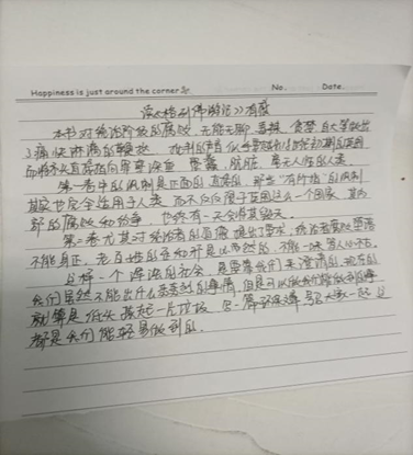 通过此次分享会,我们了解到假期是一个读书的好时机,用读书充实我们的假期生活,使原本枯燥无味的假期生活变得丰富多彩。