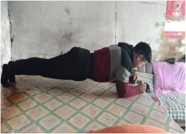 锻炼期间李冬选择了平板支撑,刚开始的时候一次坚持不了多久,但他始终没有放弃,一直坚持了下来。赵思宇选择跪姿俯卧撑,从一开始的一分钟十几个到了后来的一分钟二十几个。赵金梦选择用深蹲来锻炼身体的平衡性并训练膝关节让身体更灵巧。艾欣彤选择并肩来矫正驼背完善自身形态。锻炼过程中同学们严格按照标准动作来进行,不会因疲劳而使动作变形。