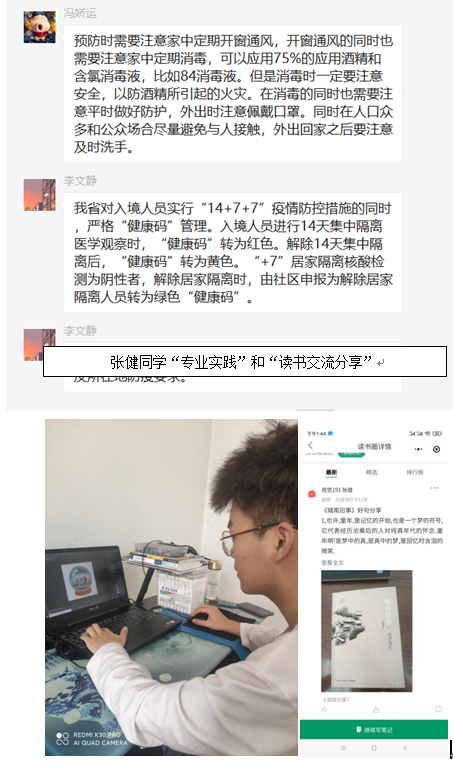 会议第二部分是特色项目分享,利用一周时间张健同学继续完成了“创校30周年纪念品的设计”和参加了“宁静而致远——读书月”活动坚持每天读书打卡,完成读书交流分享;李文静同学,本周完成了读书交流读后感的撰写,积极进行居家锻炼。积极分享自己的读书感悟;冯娇运同学继续完成读书交流分享和感恩实践,积极帮助妈妈做家务,体会到了妈妈的幸苦。张渊鼎同学本周完成了读书交流分享,也为我们推荐了一些文学作品,除此之外利用空余时间,完成了一套四级真题,不断学习,不断进步!
