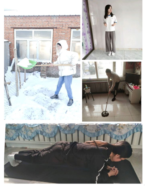 鉴于当前的疫情形势,本次活动采取居家锻炼的方式。小组成员计科183南晓双一大早就换好衣服,拿好工具到院子里与家人一起去扫雪,经过一个小时的细心打扫,将院内的雪清扫干净,也在扫雪中体会到与家人一起扫雪带来的快乐。视觉182崔可鑫跟着健身视频教程开始进行锻炼,主要进行核心力量训练和身体的协调训练。视觉182姜俊西在早饭后贴墙站20分钟,接着开始锻炼,坚持平板支撑,运动结束后进行拉伸。计科181肖善宝在早起后开始热身,选择跑步的方式锻炼40分钟,并且主动扫地擦地,让一天都充满动力。