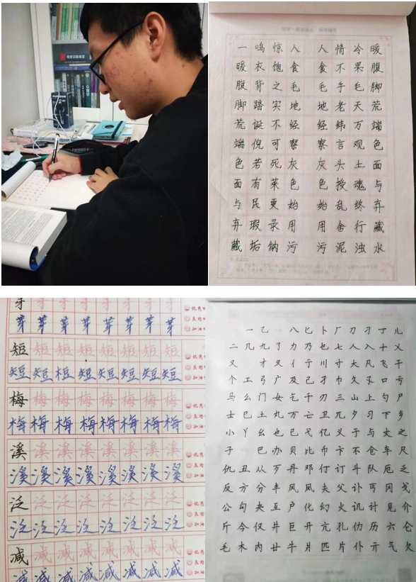 在1月11日-1月17日这一个星期内,在组长李星河的带领下,我们小组四人在家进行了临摹字帖中的内容,书写与字帖内容相同的钢楷。在临摹字帖中使我们感受到心静了下来,修正一颗浮躁的心,可以让人专心致志,全神贯注,字里千秋,字外人生,感受到写字是一种静心的修行。