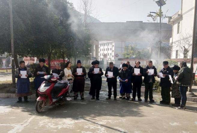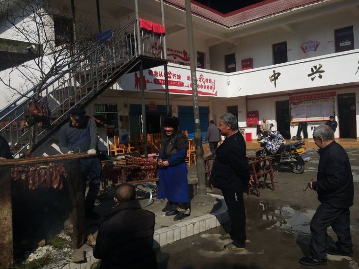 我们去的时候,村支书正和老人们在一起做熏腊肉,等他们忙完以后,村支书帮忙一起分发调查问卷组织老人们配合,然后由我们给他们解释调查问卷上的内容,让老人们根据自己的实际情况进行填写。填写完以后,我们跟老人们谈论了很久,刚开始还以为老人们会有很大的抵触,万万没想到的是,老人们非常积极,也很乐意回答我们的问题,让我们倒有些不知所措了,我们也很愿意听老人们讲他们的趣事,最后村支书提议大家一起合个影。