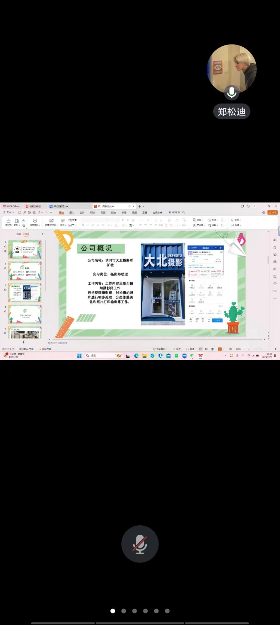 本次会议以了解学生的各项工作完成情况,针对工作过程中出现的问题进行解答为目的,开展此次会议。会议开始由周志明、李明阳、王小菊 、王富博、郑松迪五位同学进行汇报,首先,周志明同学讲述自己在学校参加培训的过程中进行的一次次更改的方案,之后,王富博同学像大家介绍了自己的工作地点、工作内容和工作环境,郑松迪也进行介绍自己一周的拍摄内容,最后王昀碧老师进行一一点评解答,并对本次制作良好的PPT同学进行表扬。提醒同学们完成专业实践学期手册和论文如何进行撰写。最后,王昀碧老师对之后汇报总结PPT的制作提出了详细的要求。希望同学们之后的PPT会制作的更加完善。