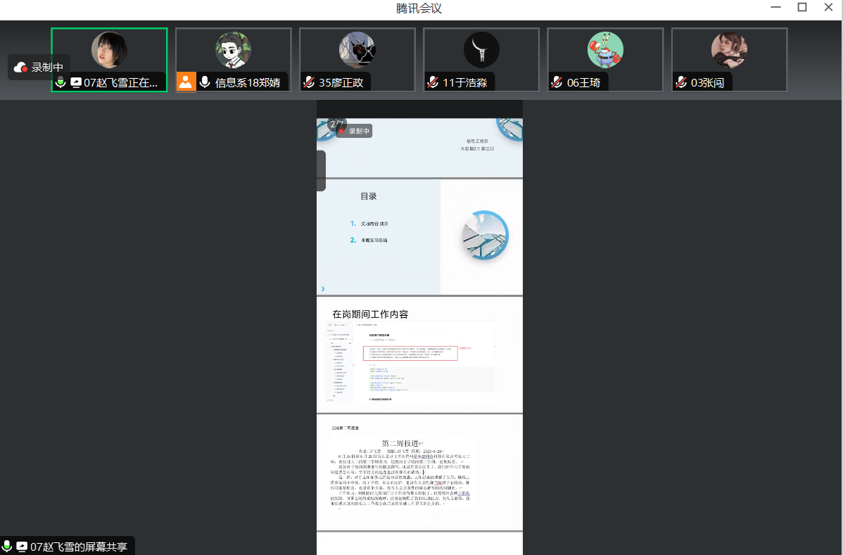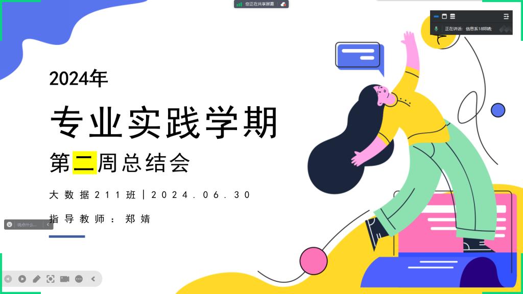 6月30日晚,大数据 211班通过腾讯会议召开专业实践学期第二周总结会。本次总结会由指导教师郑婧主持,211班全体学生参加。