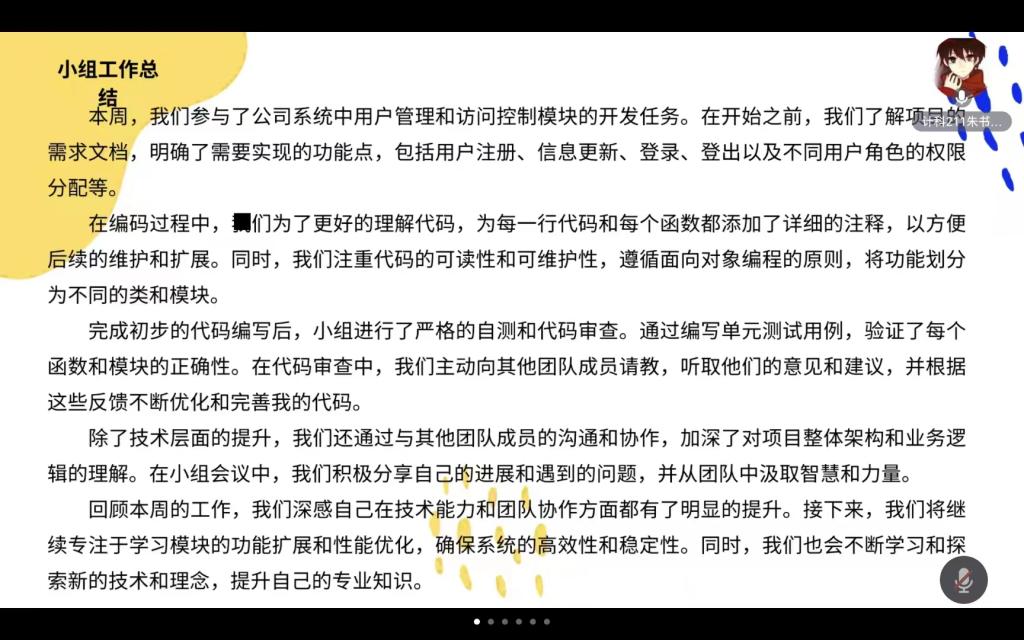 会上,山东仁行道科技有限公司实习小组对整个团队上周的工作进行了全面总结。例如顺利完成每日打卡、完成实习单位给定的每日任务以及完成小组任务。同时,指导老师彭博、耿闯对团队工作和团队协作方面取得的进步提出了表扬。此外,指导老师彭博也指出了各团队存在的问题和挑战,包括部分项目进度滞后以及部分团队成员在沟通协作方面有待提高。为了解决这些问题,她提出了一系列具体的改进措施,如加强项目进度管理、提升团队协作能力等。会议的最后阶段,指导老师彭博、耿闯对各团队进行了专业实践学期安全教育,希望各位同学专业实践学期保证好自身安全。