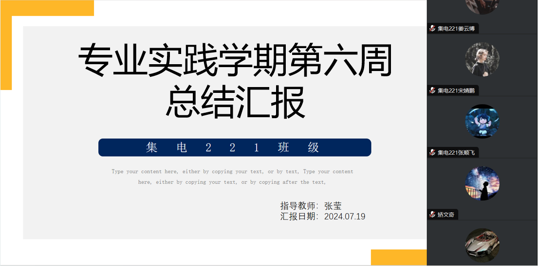 7月28日,集电221班召开专业实践学期第六周总结会,本次会议由指导教师张莹主持,221班全体同学参加,本次会议旨在总结过去一周的实践情况,分享实践经验,并探讨未来工作的方向。