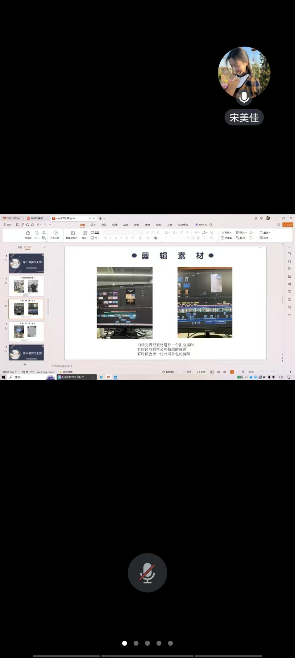 本次会议以了解学生的第七周工作完成情况,针对第七周工作中出现的问题进行解答为目的开展。会议开始由宋美佳、邢婉钰、任美霖、张舒雅、冷茹茂五位同学进行汇报,在会议的开始宋美佳同学展示了自己在一整个实习阶段所参与的公司视频拍摄、剪辑和发布。邢婉钰同学展示了自己跟着指导教师进行学习的过程以及进步。任美霖同学向同学们讲述了从一个软件的基础到进阶的学习过程。最后王昀碧老师对此次会议进行了总结,实习已经进入结尾,此次实习是一次宝贵的经历,它让你们看到了知识与实践的结合,明白了团队合作的重要性,也更加清晰了自己未来的方向。也许你们遇到过困难,有过迷茫,但正是这些挫折,让你们变得更加坚强和成熟。