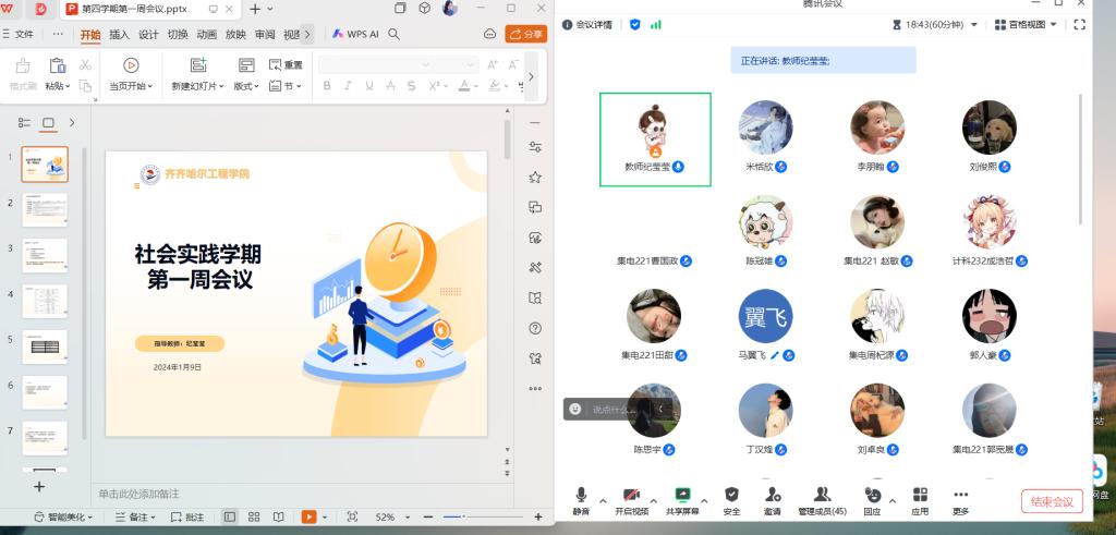 为帮助学生顺利完成社会实践学期任务,提升学生“三五能力”,生涯导师纪莹莹于1月9日晚通过腾讯会议召开了社会实践学期第一周指导会,共43名学生参加。