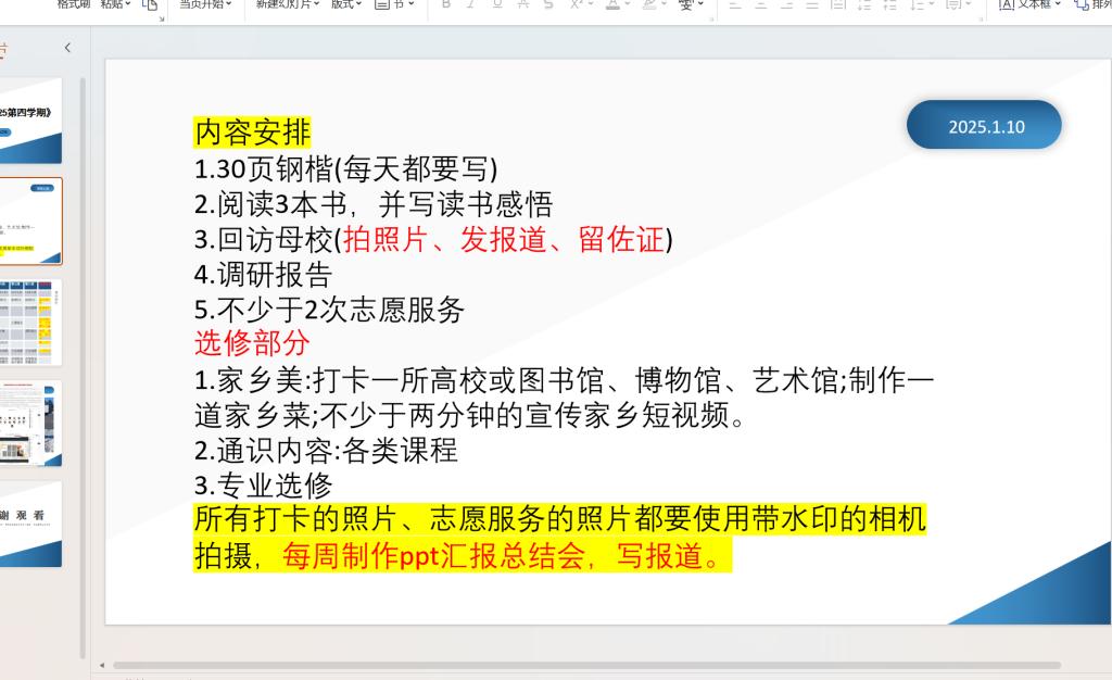 首先,张晶老师向同学们说明了社会实践学期的重要性及注意事项,提醒同学们认真完成各项目作业。然后,由视觉221班丁晓彤学长汇报讲解各项作业完成要求,涵盖了钢楷临摹、阅读书籍、志愿活动、通识教育、调研报告、专业作业等,详细介绍并说明了每项作业完成形式和方法,并附有照片样例,旨在帮助同学们认识深刻,引导同学们按照标准认真完成。特别强调了作业的完成时间和注意事项,鼓励同学们合理的安排假期时间,认真完成作业,为新学期的学习打下坚实的基础。最后,张晶老师指出每周的总结会同学们都要全面仔细汇报,认真完成每一项任务。