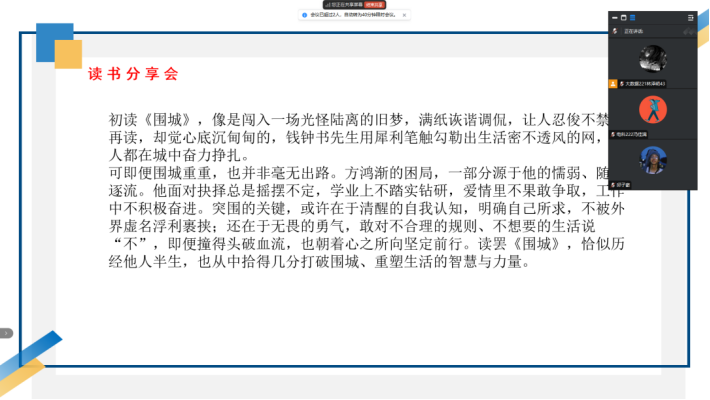 本次读书讨论会旨在深化成员对近期共读书籍的理解、分享多元感悟、激发深度思考以及营造浓厚的团队学习氛围。会议伊始,组长邱子豪点明阅读经典书籍对拓宽视野、滋养心灵的重要意义,鼓励大家畅所欲言,不要拘泥于既定框架,把这场讨论当作一场思想的 “盛宴”。紧接着,介绍本次共读的《围城》,用精炼的语言回顾书籍的核心脉络与关键主题,确保每位成员对讨论蓝本有清晰的轮廓认知。