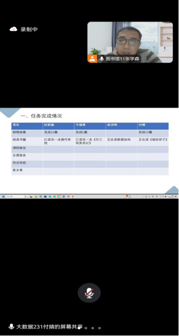 并由SHSJ-355小组成员付婧同学进行第一次周总结汇报,本周任务完成良好,组内成员都阅读了相关书籍和进行钢楷临摹,并在未来一周进行志愿服务,回访母校,打卡高校和调研报告的撰写。