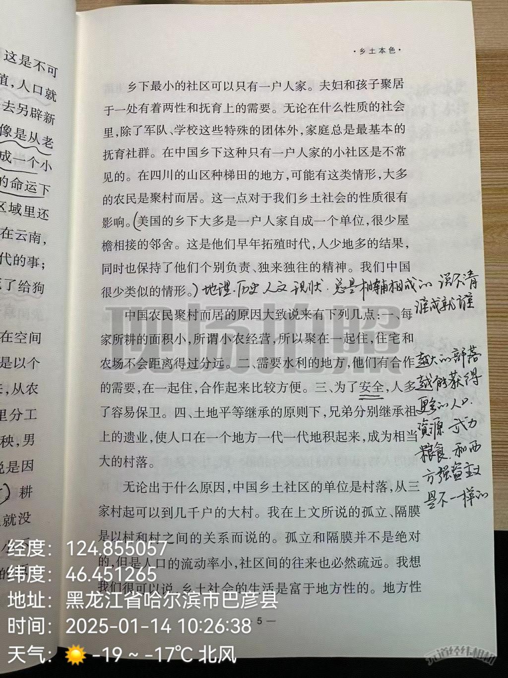1月14日上午,吴雪岩翻阅《乡土中国》,从中了解费孝通先生以深厚的学术功底,为我们勾勒出中国乡土社会的清晰轮廓。