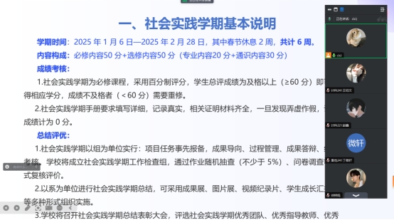 2025年1月10日,社会实践学期指导教师刘茜蓓在腾讯会议平台召开周例会,此次会议由社会实践指导教师刘茜蓓主持。会议旨在为学生提供全面的指导与规划,助力他们深入理解并准备即将开展的社会实践活动。会议伊始,刘茜蓓老师以清晰的逻辑,详尽地阐释了社会实践学期的整体架构及核心理念,她以简洁明了的言辞为大家解析了本学期的重点任务与关键节点。她特别指出,今年的任务与往年有所不同,提醒大二及大三的学生切勿仅凭过往经验行事,确保在实践过程中能够应对新的挑战与要求。