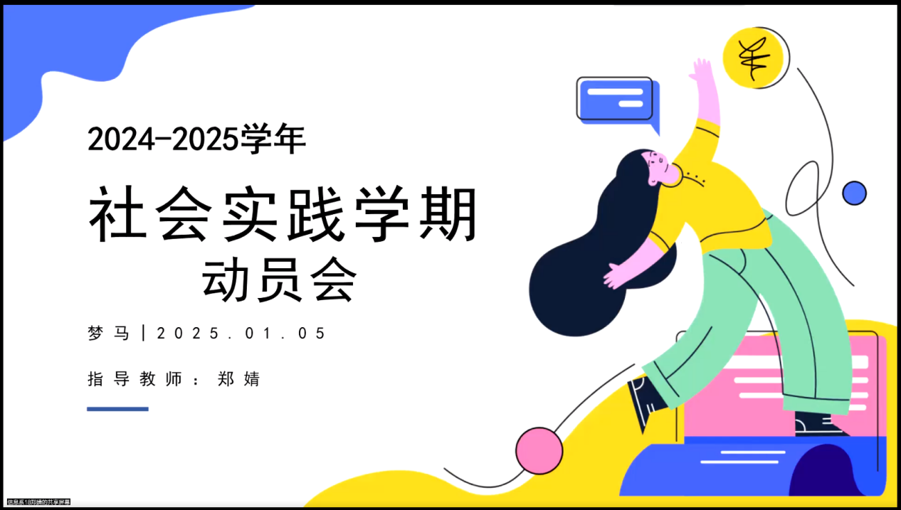 1月5日下午,郑婧老师通过腾讯会议组织召开了社会实践学期动员会,本次会议由郑婧老师主持,共21人参加。