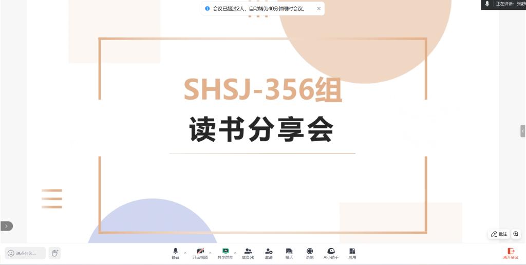 1月19日晚上,SHSJ-356小组在线上开展了读书分享交流活动,通过线上交流的形式,激发阅读兴趣,提高阅读质量,培养阅读习惯,营造阅读氛围,促进知识传播和思想交流。
