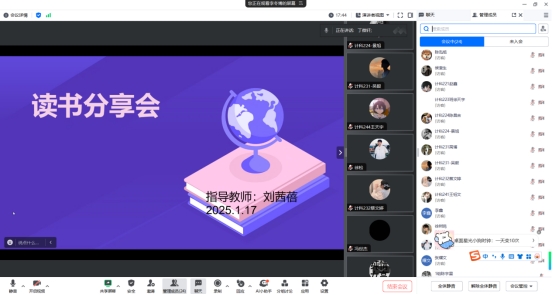 1月17日,指导教师刘茜蓓在腾讯会议平台举办社会实践学期读书分享活动。本次活动由刘茜蓓老师主持,旨在通过线上交流的方式,让学生们在寒假期间也能保持学习的热情,分享社会实践与阅读相结合的独特体验。