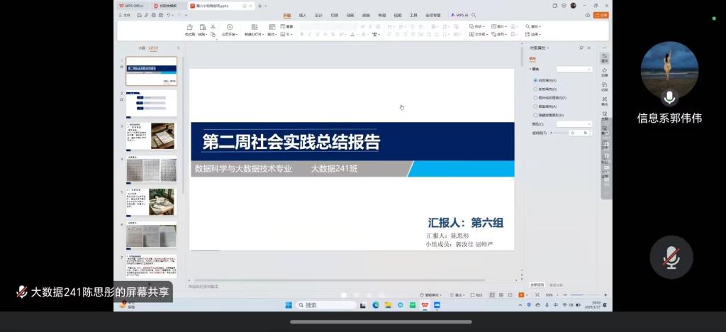 2025年1月18日晚,指导教师郭伟伟通过腾讯会议召开了第四学期第二周总结会,对6个小组第二周社会实践情况总结并指导,本次会议共有25名生涯学生参加。
