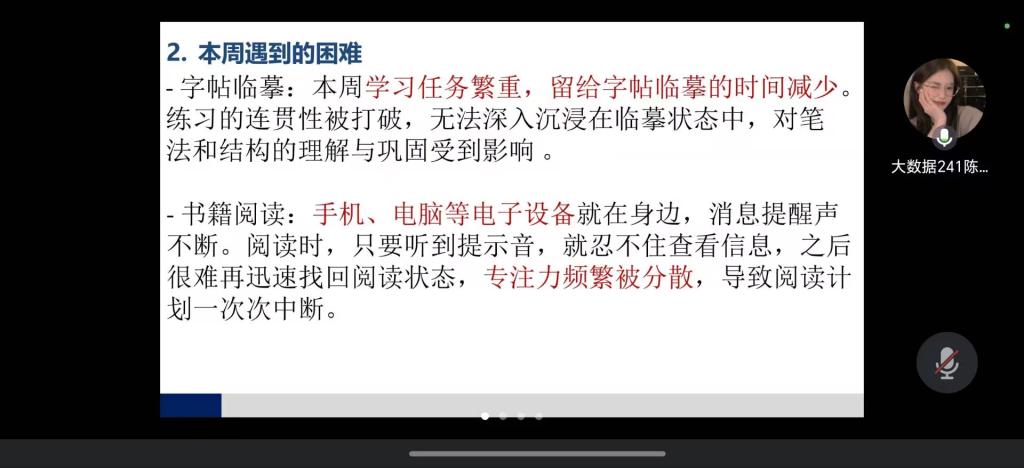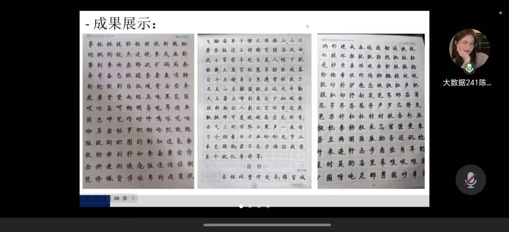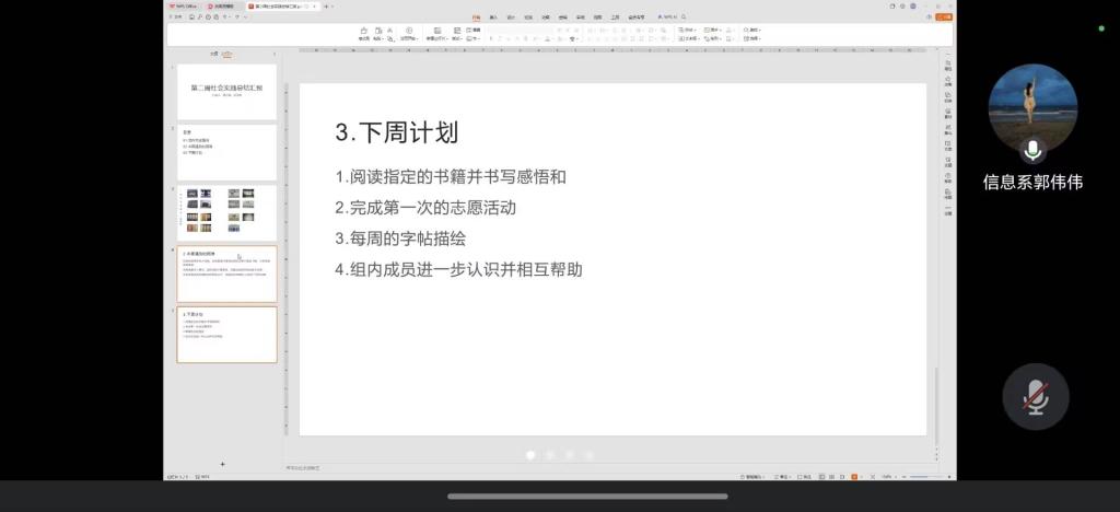 会议开始,各小组汇报了第四学期第二周开展情况,分别展示了各组每位同学字帖临摹成果、SHSJ-209小组回访母校进班宣讲、SHSJ-211小组家乡美——打卡博物馆活动、SHSJ-210、SHSJ-212、SHSJ-213、SHSJ-214小组线上读书交流活动等情况,交流了社会实践学期的经验和感悟,并对后续活动开展做出计划。指导教师郭伟伟对家乡美和回访母校活动予以肯定,并对读书交流活动详细指导,为后续活动计划把关,并对学生的困惑逐一分析解答。郭老师再次强调社会实践要注意安全,要体认融入社会的重要性和必要性,爱国爱校,传递传承。