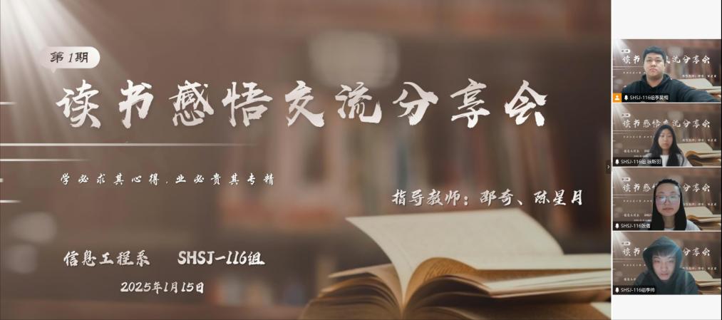 2025年1月15日,在生涯导师邵奇、辅导员陈星月的指导下,信息工程系SHSJ-116小组召开了第一期读书感悟交流分享会。此次交流会聚焦专业领域相关书籍,为小组成员们搭建了深入学习与交流的平台。