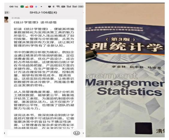 SHSJ-106小组成员纷纷开启了阅读之旅,沉浸在各类书籍的知识海洋中。首先,组长尚晨曦选择了人文社科类书籍《长安客》,通过阅读去领略书中所展现的别样故事与人文风貌,感受那段独特历史中的人物悲欢。组员王琦晶则专注于专业类书籍《统计学管理》,为提升专业素养积极汲取知识养分,扎实专业基础,力求在专业领域能有更多收获。组员谢佳航阅读的是人文社科类书籍《中国美学》,在书中探寻中国美学的独特韵味与深厚内涵,拓宽自己在人文领域的认知视野。