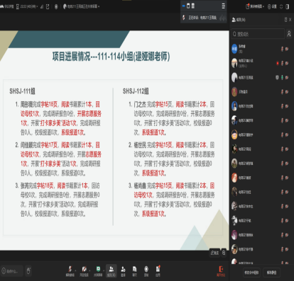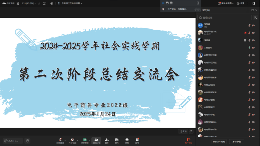 为回顾和总结学生们在前三周社会实践过程中的经验和收获,并为接下来的实践活动提供指导和建议。特此,电子商务专业于1月24日下午在线上开展“社会实践学期中期阶段总结”会议。本次会议由辅导员老师陈星月主持,电子商务专业22全体级组长、生涯导师和党员学长参加。