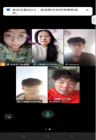 1月26日下午。信息工程系社会实践小组在腾讯会议上针对社会实践的任务展开讨论,本次会议共有董杨主持,学生封明坤,王淳,张宇航,马忆楠共5人参加
