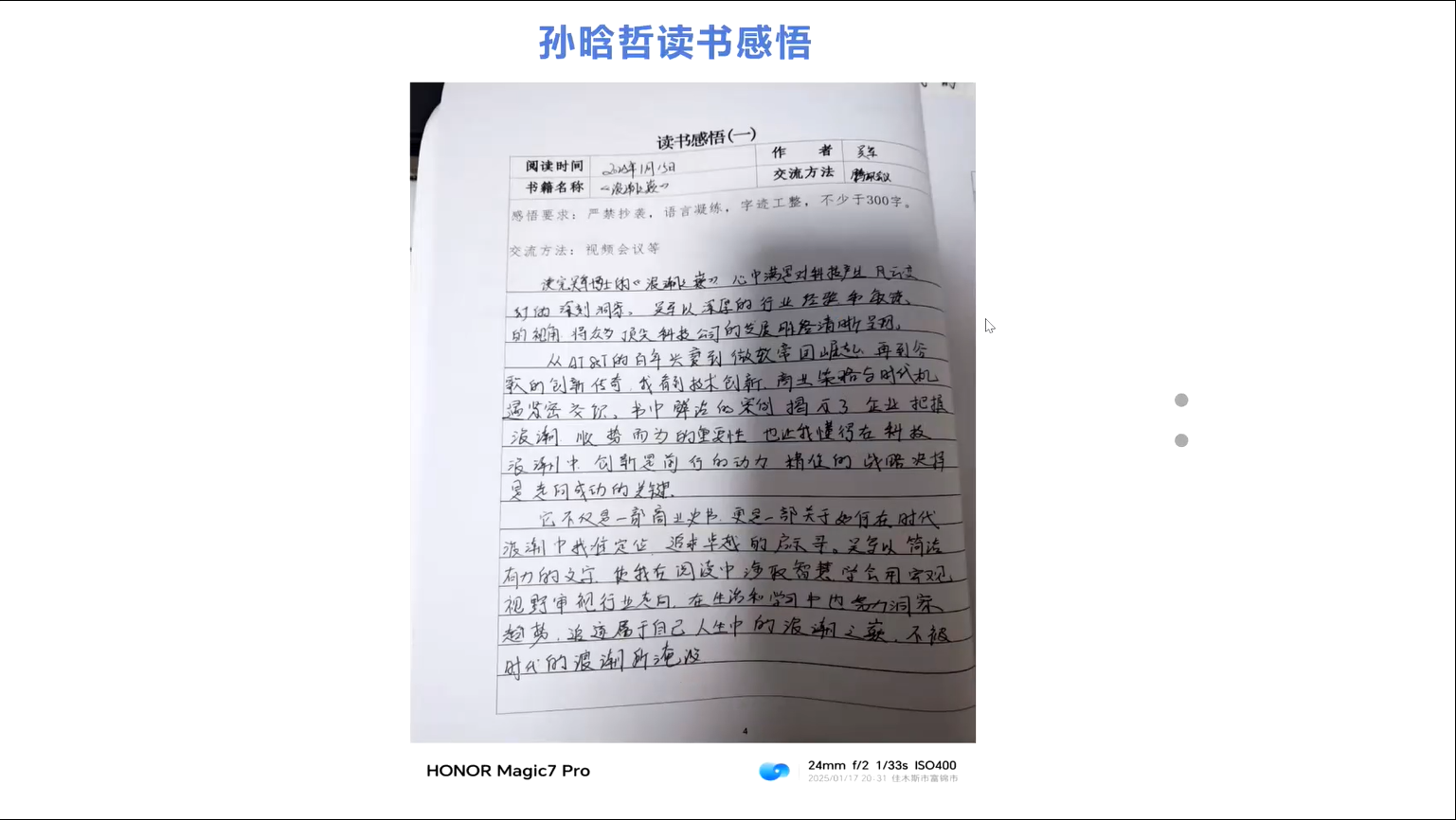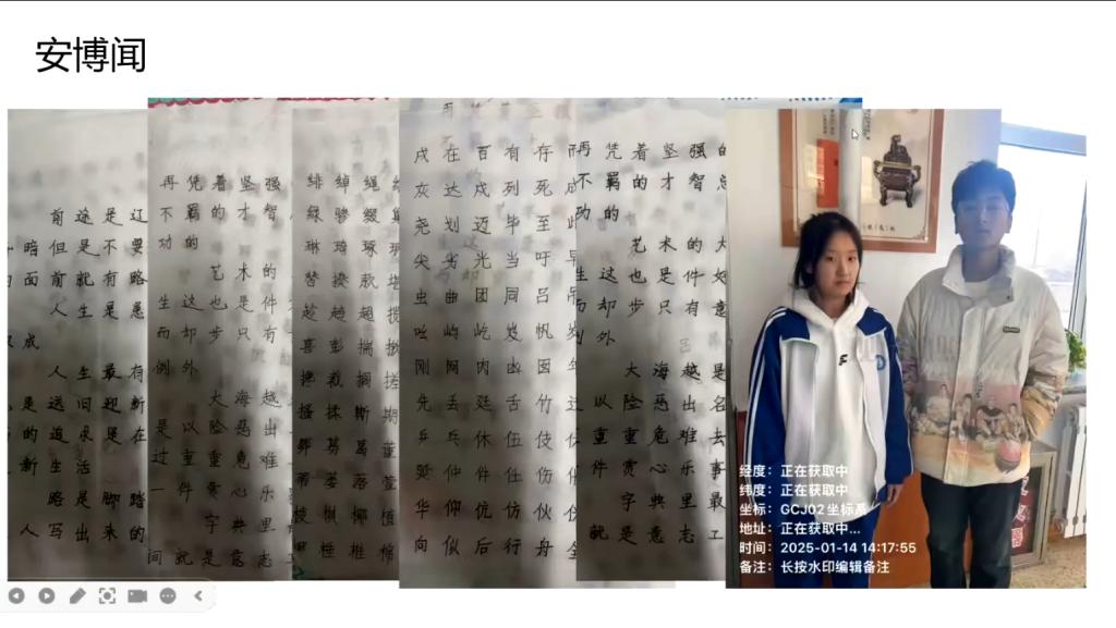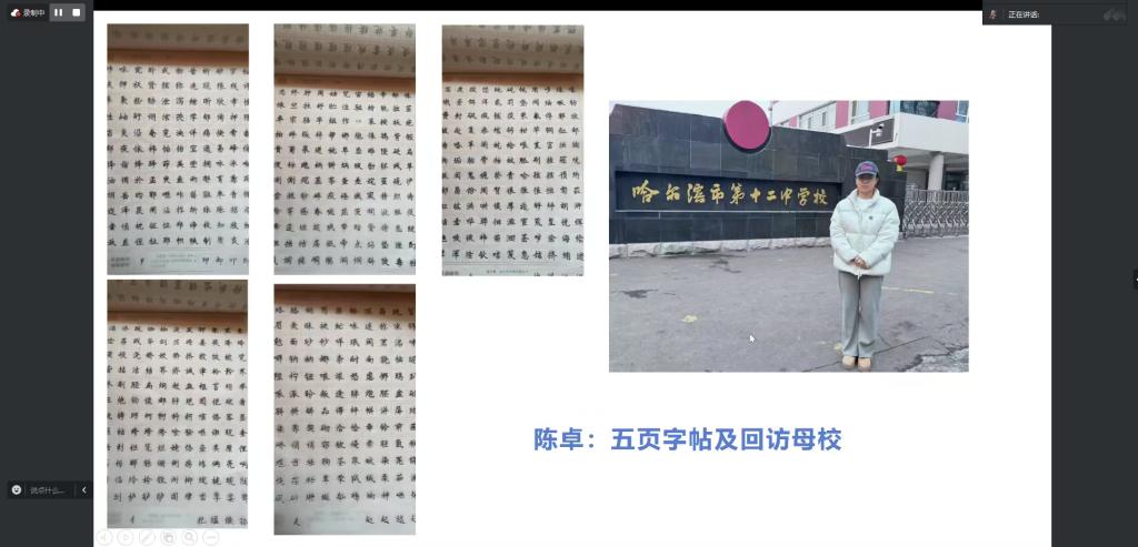 各小组代表分别汇报了第三周社会实践情况。6个小组展示了字帖临摹成果,每位同学都有进步,提升了汉字书写能力,传承了书法文化;SHSJ-209、SHSJ-211、SHSJ-212小组分享了阅读专业推荐书籍和哲学社会科学类书籍心得体会;SHSJ-212、SHSJ-214小组汇报了开展志愿服务情况,将知识学习与服务社会结合,以实际行动传递温暖,在奉献中收获成长;SHSJ-213小组李诗琦、胡磊、宋佳蓉、刘世豪、陈卓,SHSJ-211小组王智慧,SHSJ-214郭汝佳,SHSJ-210小组安博闻踏上回访母校之旅,重温青春记忆,为学弟学妹分享经验,助力成长。