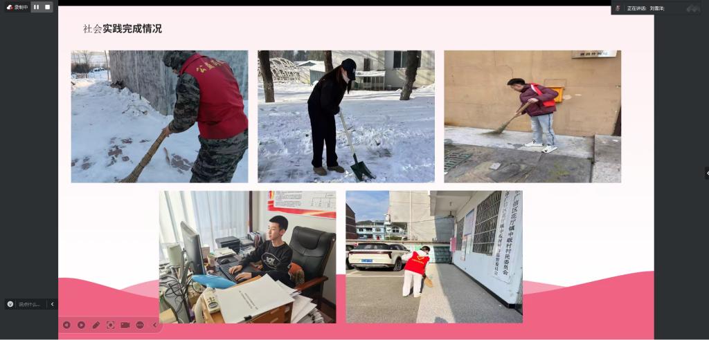 孙晗哲梳理了社会实践劳动教育-烹饪实践课、家校课堂-护“生”安全从“心”开始、社会实践学期专业选修、通识教育德育(大学生心理健康教育和马克思主义学院德育课堂)完成情况;并分享了社会实践回访母校和志愿服务的经验。