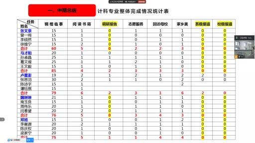 会议伊始,李献民针对计科专业近期各项实践任务完成情况进行全面总结。数据显示,钢楷临摹和阅读书籍这两项任务,同学们完成得较为出色;志愿服务、回访母校以及“家乡美”活动的完成情况处于中等水平。然而,新闻报道和调研报告的完成度较低,部分同学在任务进度和质量上存在明显差距,学习通班级群作业完成情况也不理想,且提交时间较为集中,多在每周五下午。李献民对此提出改进措施,着重强调志愿服务应按时推进,新闻报道组长要切实履行职责,组织并督促组员及时完成稿件撰写和提交工作,同时提醒全体同学要在保证质量的前提下,严格遵守时间节点,始终将安全放在首位。