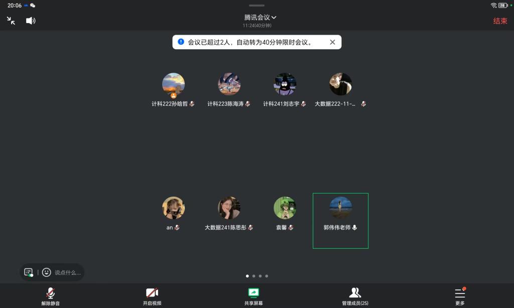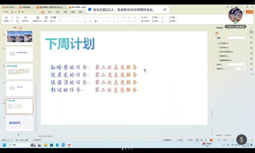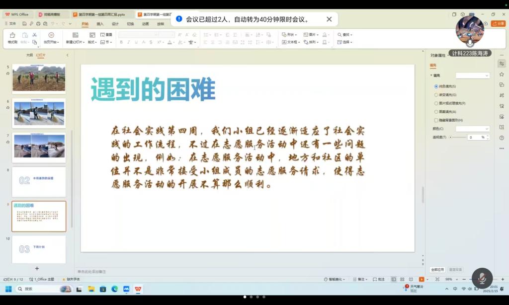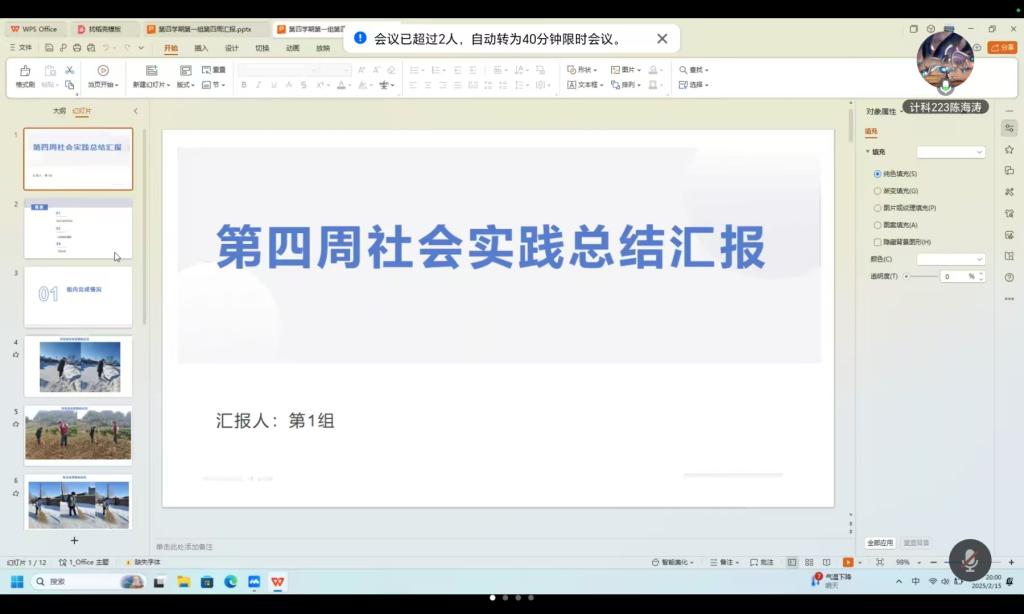 2025年2月15日,生涯导师郭伟伟以腾讯会议方式召开社会实践学期第四周总结会,本次会议由纵向班级班长计科222班孙晗哲主持,共25名学生参加。