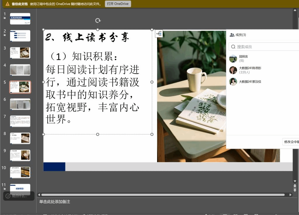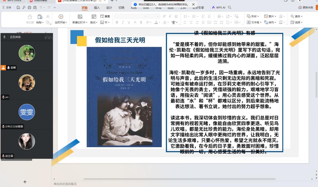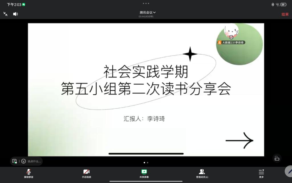 SHSJ-211和SHSJ-213小组刘志宇、毛宇辉、王智慧、王剑翔、李诗琦、胡磊、宋佳蓉、刘世豪、陈卓完成了第二次读书分享会,SHSJ-210小组袁馨、安博闻、徐雯雯、赵芷曼4名召开了第三次读书分享会,SHSJ-214小组屈师言、陈思彤、郭汝佳召开了第三次读书分享会,在书香中交流思想,碰撞出智慧的火花,拓宽了视野。