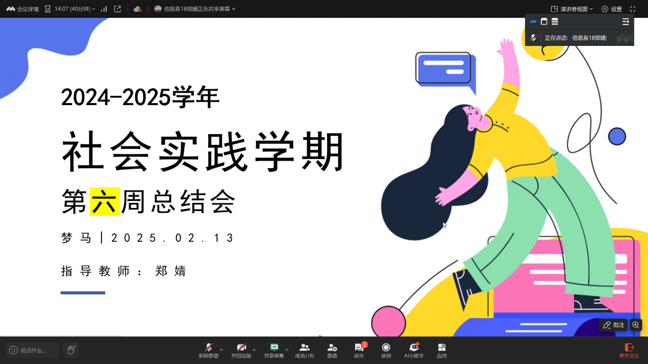 2月13日下午,指导教师郑婧召开社会实践学期第六周(第四次)总结会,共18位同学参与。