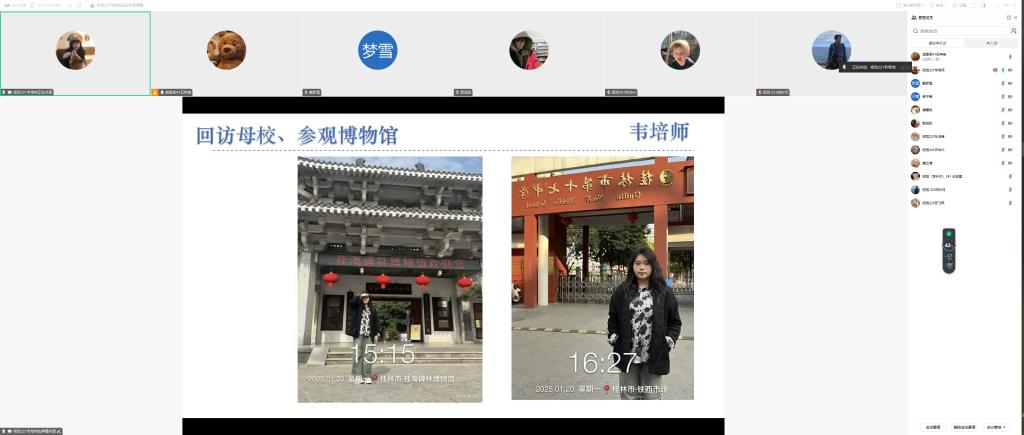 2025年1月25日,信息工程系生涯导师石祥瑞主持召开了社会实践学期第三周成果汇报会议。本次会议围绕各小组回访母校和参观博物馆以及专业任务三部分展开,共16人参会。