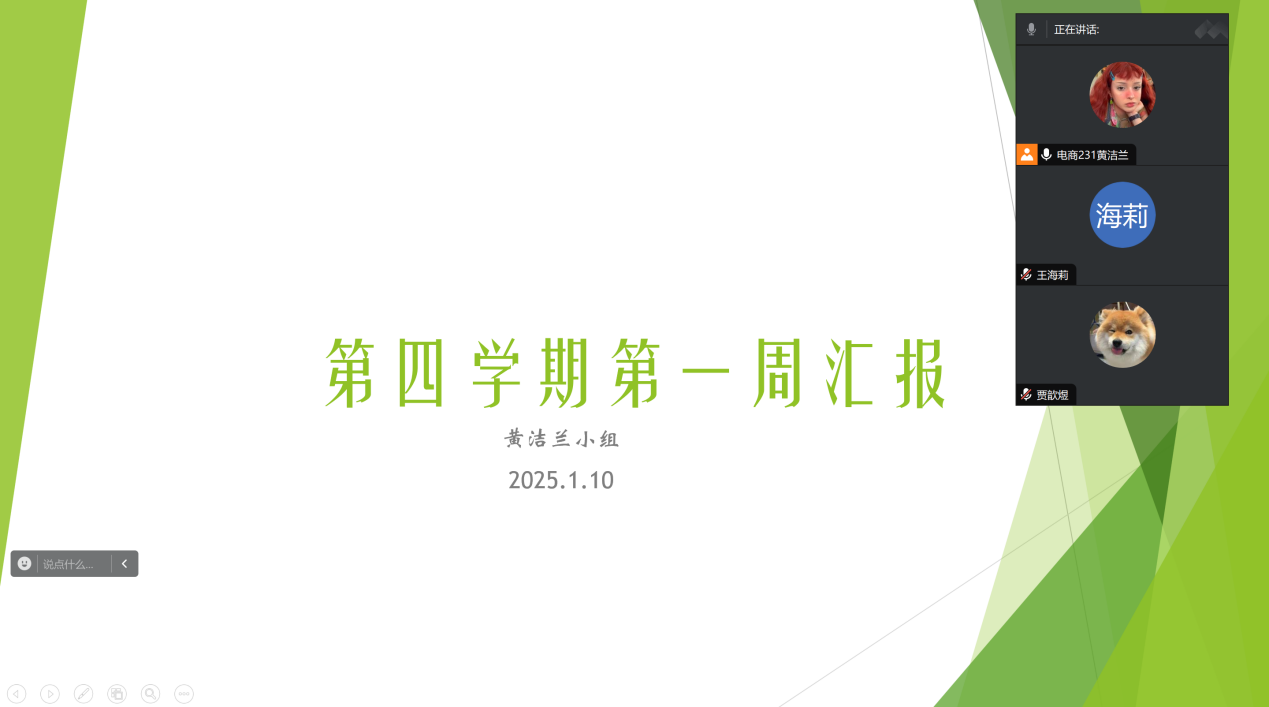 社会实践学期正式开始一周,同学们陆续完成了任务,特此小组组长黄洁兰于1月10日中午午12时00分在腾讯会议开展SHSJ-113小组社会实践学期第一周汇报。本次汇报由黄洁兰主持,共3名同学参加汇报。