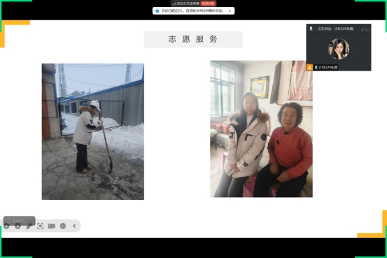 此次活动以展示自己的志愿服务成果为目的,激发他们继续投身志愿服务的热情和动力。首先,朱薇分享了他志愿服务过程,分别走访了他所在村里的空巢老人家庭,热情地与老人们打招呼,询问他们的身体状况和生活情况,并为老人们清理院内的冰雪,他表示通过这次活动不仅为空巢老人们带来了实实在在的帮助和温暖,也让他深刻认识到了社会责任的重要性。