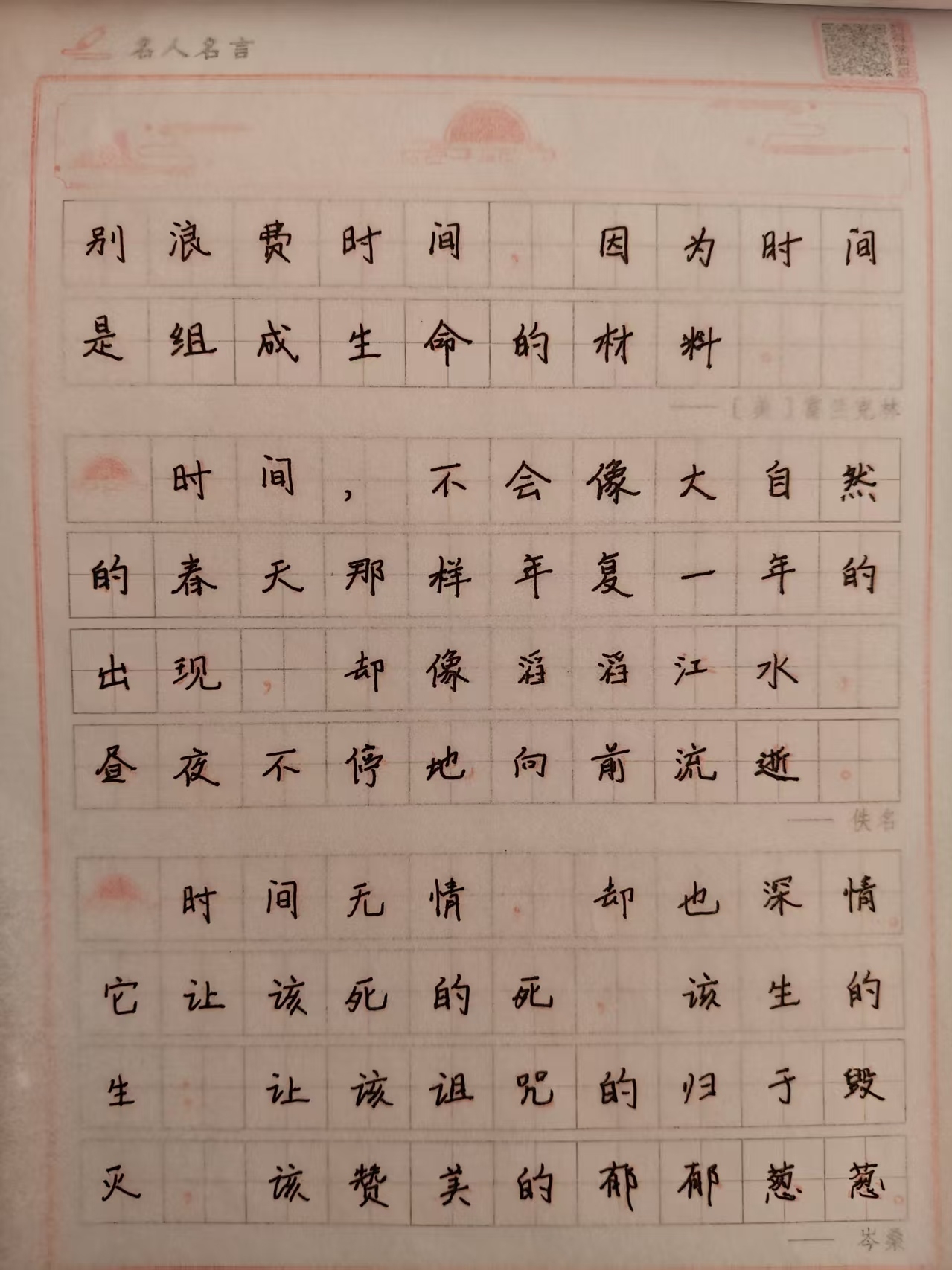小组成员有李韩敏、左珈硕、朱木子、严浩成,在练习过程中,大家通过线上群组分享自己的练字成果,相互交流心得与体会。有人感慨,在家中练字让原本忙碌的生活多了一份宁静,每一次书写都是与自己内心的对话;还有人表示,通过这次活动,不仅提高了自己的书写水平,还增进了与家人之间的互动,一起练字成为了家庭中的温馨时光。