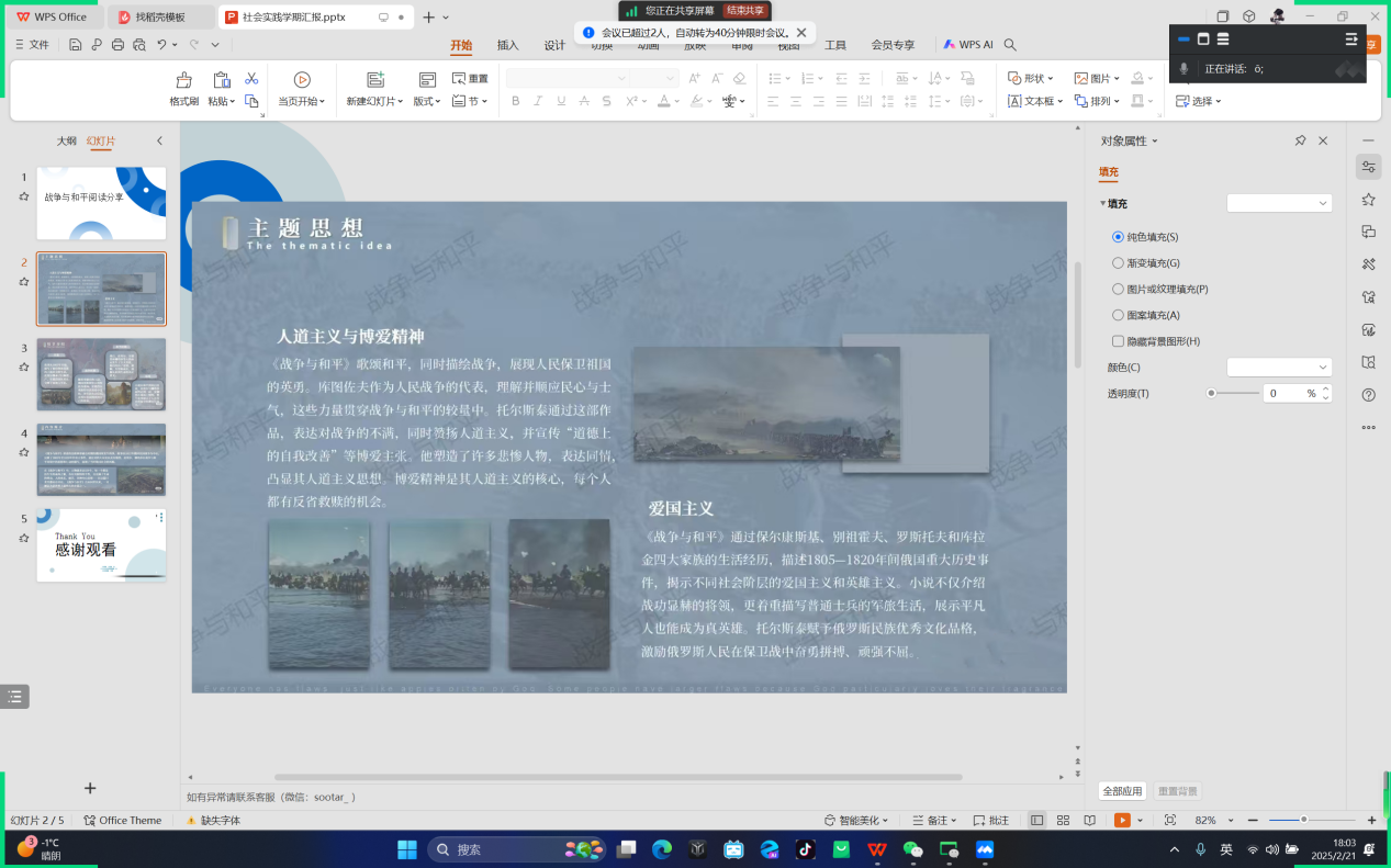 其次,她分享了书中关于爱与和平的主题。她提到,安德烈和皮埃尔两位主人公的成长历程,反映了人生迷茫、困惑、思考、探索、收获的过程。他们的故事告诉我们,人生的意义在于爱,爱生活,爱每一个人,爱每个事物。这种爱,不仅是对他人的关爱,更是对和平与正义的向往。《战争与和平》不仅是一部文学经典,更是一部人生指南。它教会我们如何面对生活中的挑战与困境,如何珍惜和平与幸福。