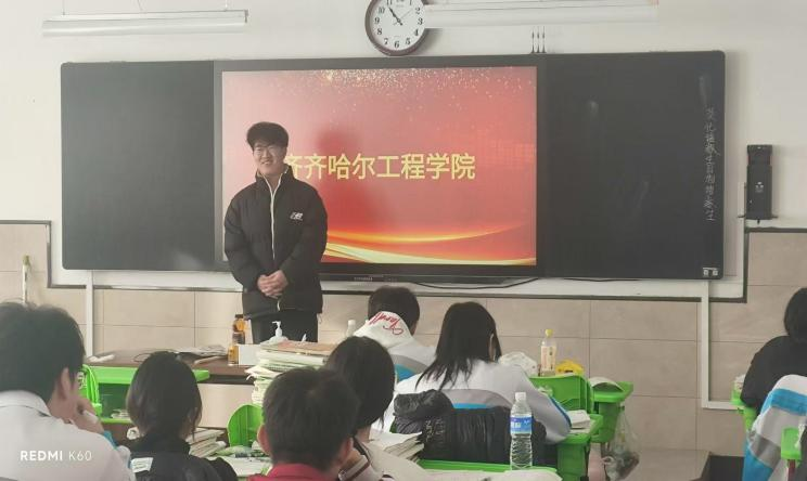 王愉凯同学回访了高中母校五常市第二中学校,回到熟悉的高中校园,他首先拜访了曾经的任课老师及班主任,并向学弟学妹们详细介绍了就读的齐齐哈尔工程学院,王愉凯同学走进学弟学妹们的教室,他通过精心制作的PPT,从校园环境、专业设置、实践教学等多个方面,讲解了齐齐哈尔工程学院的特殊之处。在介绍学校设施时,他特别提到了知甘堂、人民会堂的建设,详细描述了这些设施的特点和优势。他还详细讲述了所学专业的课程设置、就业前景以及在学习过程中的收获与感悟,并且讲解了本专业的就业方向以及就业前景。这次母校回访拉近了他与高中的纽带,并且让学弟学妹们了解了齐齐哈尔工程学院。
